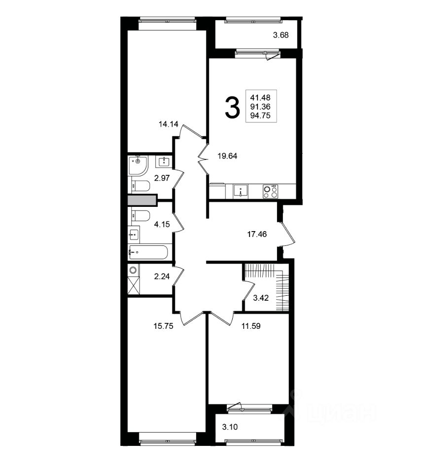 Продаётся 3-комнатная квартира в строящемся доме (Корпус 6), срок сдачи: 2-кв. 2026, общей площадью 94.75 кв.м., на 1 этаже.