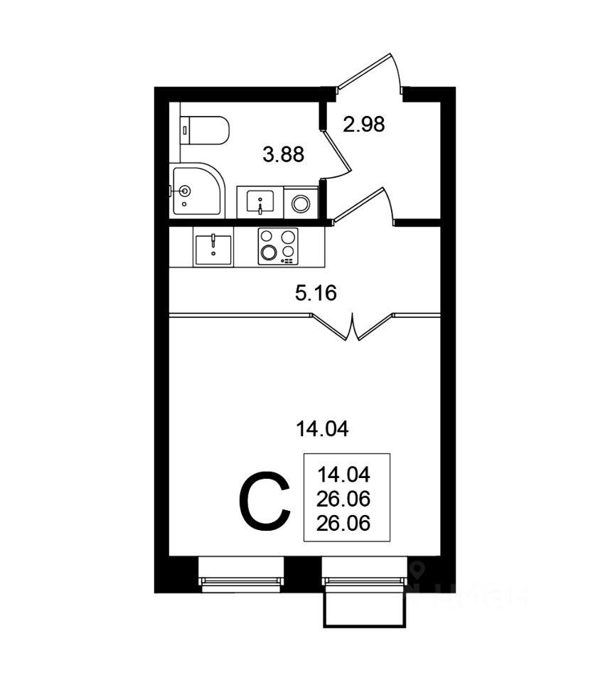 Продаётся студия в строящемся доме (Корпус 6), срок сдачи: 2-кв. 2026, общей площадью 26.06 кв.м., на 5 этаже.