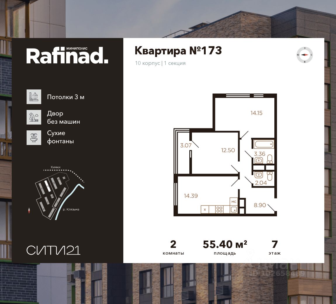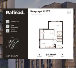 Продаётся 2-комнатная квартира общей площадью 55.40 м² на 7 этаже.