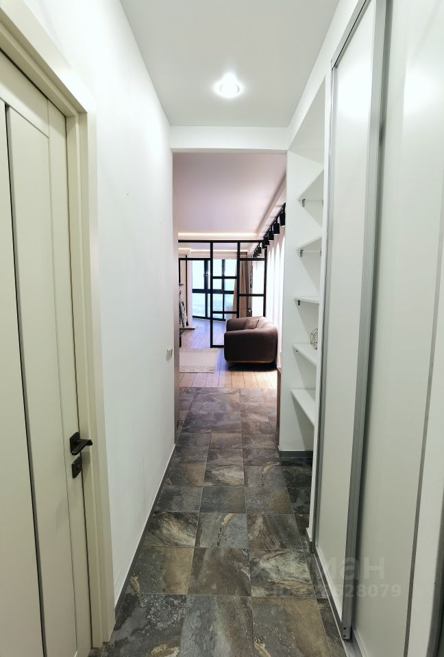В квартире удобная эргономика, стеклянная перегородка разделяет зоны, можно добавить текстиль, на потолке заложены скрытые карнизы.