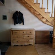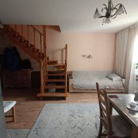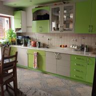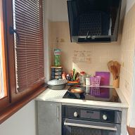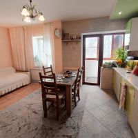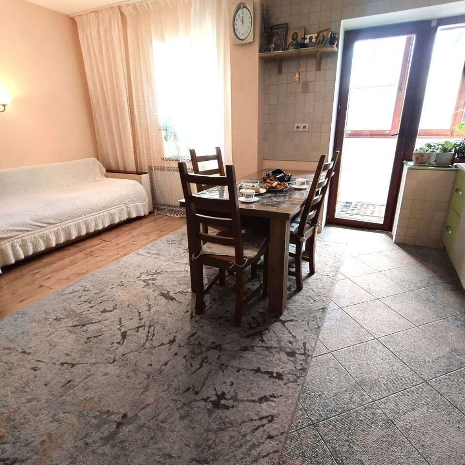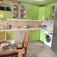 Просторная кухня- гостиная с санузлом. На кухне также есть выход на застекленную лоджию с замечательным видом на зеленый сад.
