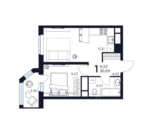 Главная особенность — кухня 17,21 метров. Это не стандартная однушка, а полноценное пространство для жизни, где можно организовать просторную кухнюгостиную и отдельную спальню. Фактически вы получаете планировку евродвушки.