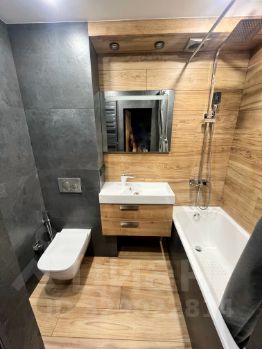Ванная: санузел совмещенный, ванна и раковина французского бренда Jacob Delafon, душевая система с тропическим душем. Унитаз и инсталляция фирмы Geberit.