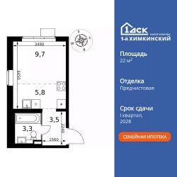 Продаётся квартира-студия номер 287 общей площадью 22.3 кв.м. на 2-м этаже 17 этажного здания. Предчистовая отделка. Цена с учётом скидки.