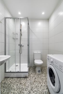 • Санузел — плитка на стенах и полу, установлена сантехника