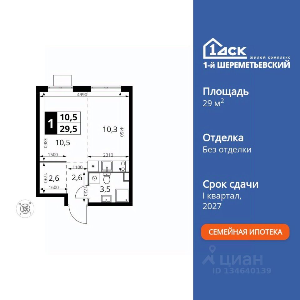 Продаётся квартира-студия номер 22 общей площадью 29.5 кв.м. на 5-м этаже 16 этажного здания. Без отделки.