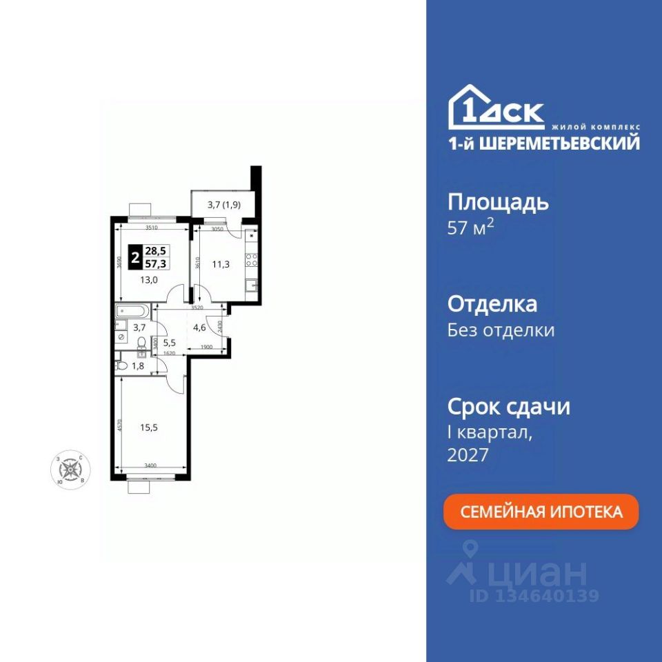 Продаётся 2-к квартира номер 1064 общей площадью 57.3 кв.м. на 8-м этаже 17 этажного здания. Без отделки.