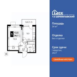 Продаётся 1-к квартира номер 1218 общей площадью 34.1 кв.м. на 5-м этаже 17 этажного здания. Без отделки.