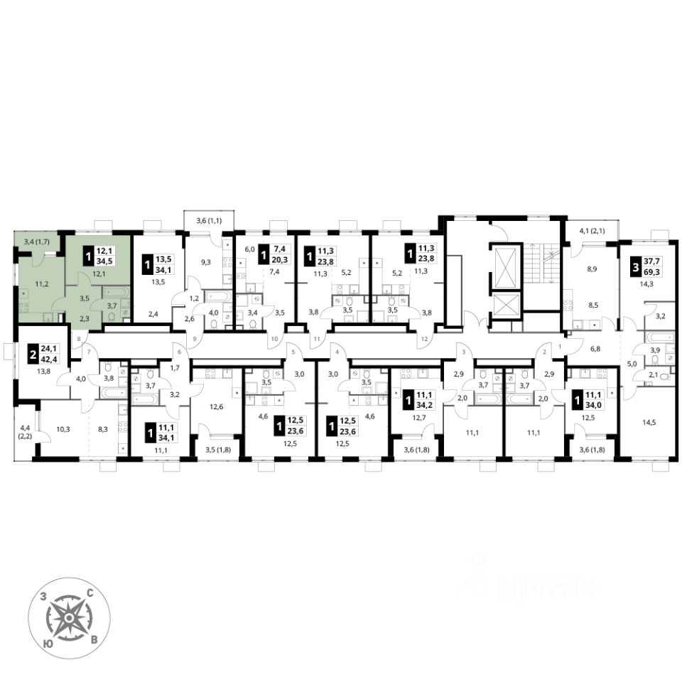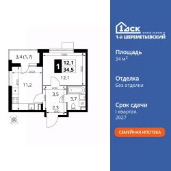 Продаётся 1-к квартира номер 1277 общей площадью 34.5 кв.м. на 10-м этаже 17 этажного здания. Без отделки.