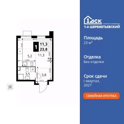 Продаётся квартира-студия номер 1293 общей площадью 23.8 кв.м. на 11-м этаже 17 этажного здания. Без отделки.