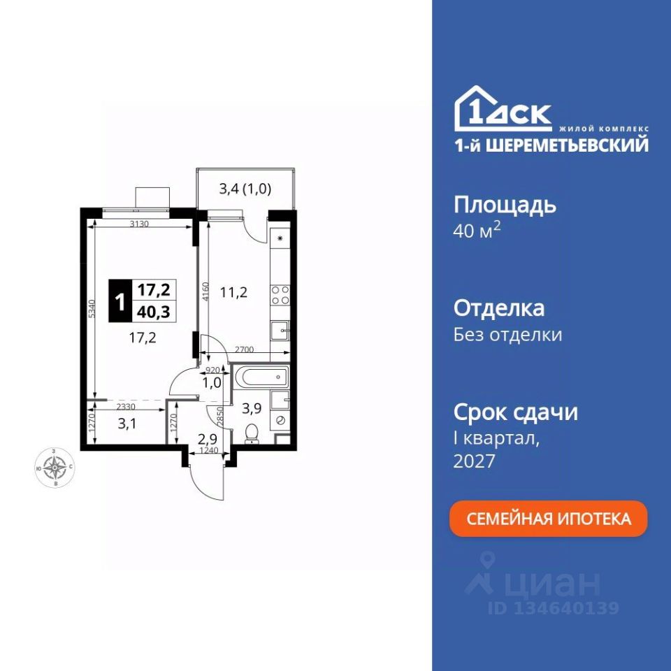 Продаётся 1-к квартира номер 391 общей площадью 40.3 кв.м. на 6-м этаже 17 этажного здания. Без отделки.