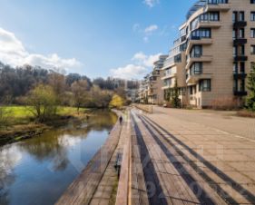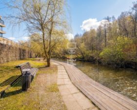 В комплексе предусмотрены прогулочные зоны вдоль реки Сходня, детские и спортивные площадки, подогреваемый бассейн, детский сад, кофейни и рестораны.