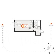 Комната 12.9 кв. м и кухонная зона 3,6 кв. м. Совмещенный санузел 3,7 кв.м.
