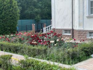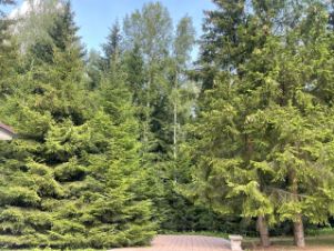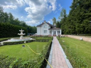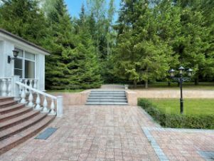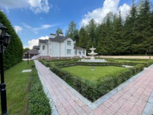 Участок 35 соток под ИЖС, по фронтальной части кованый забор с автоматическими воротами. Часть участка занимает парк с газоном и розарием. Дорожки выложены гранитом. Парковый ансамбль с фонтаном (мрамор Италия, оговаривается отдельно). За домом лесная часть участка с огромными елями, соснами и березами. По всему участку проложен автополив. Перед домом выложенная брусчаткой парковка на 4 а/м. Имеется большой хозблок с помещением для проживания персонала.