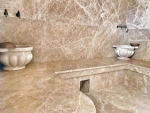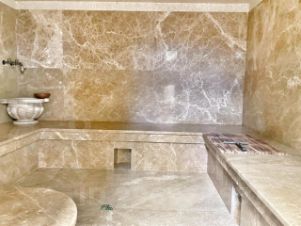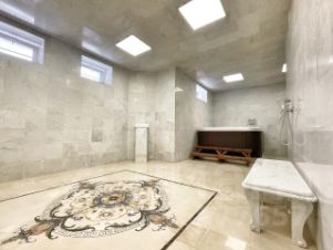 Цокольный этаж комната отдыха, комната с джакузи на 6 человек, хамам из натурального мрамора, с/у, котельная.