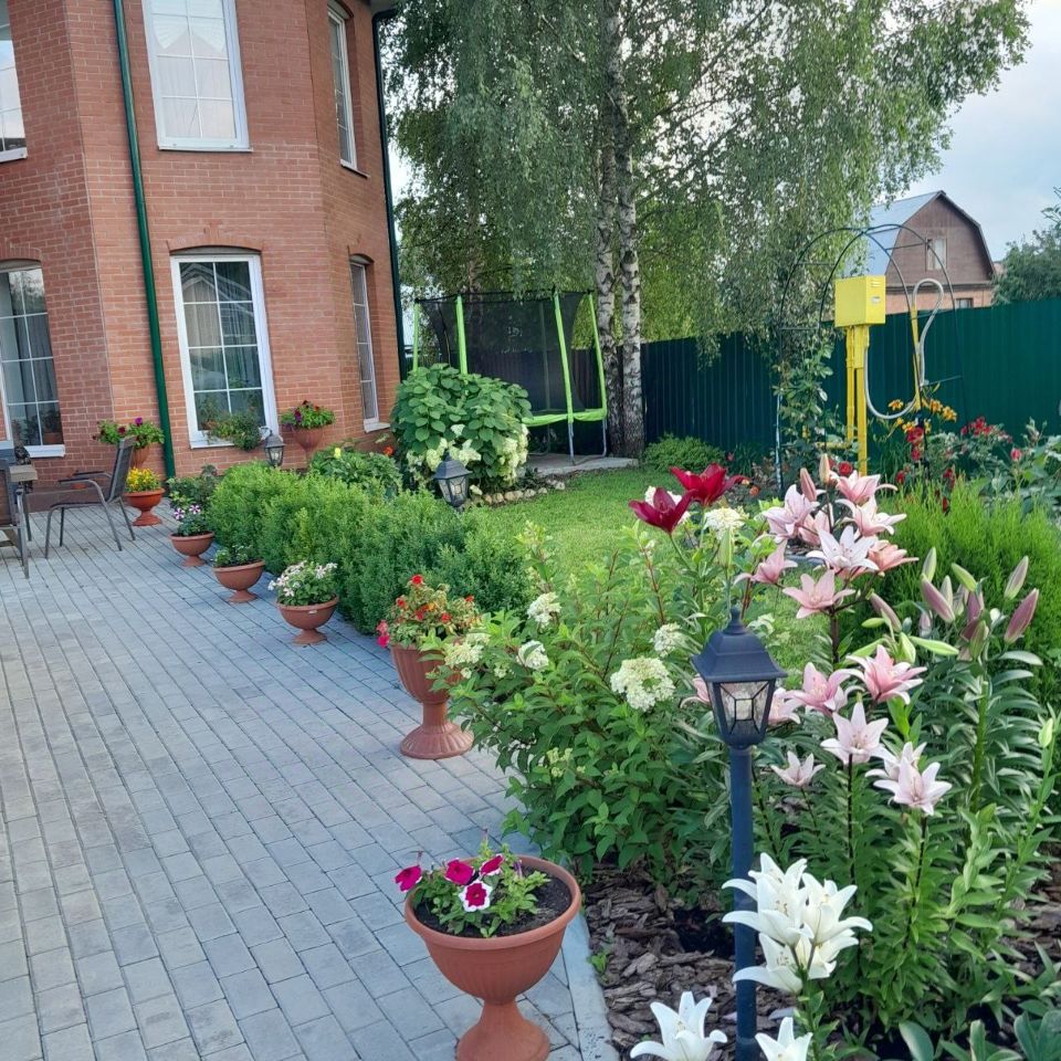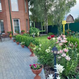 Участок красиво оформлен. Площадка перед домом 100м2, выложена плиткой, а также дорожки вокруг дома и площадка зоны барбекю. Площадка перед домом украшена аллей самшитов и цветником с декоративными кустарниками и цветами: туи, можжевельник, чайное дерево, лилии, рододендрон. Перед домом газон с аркой из плетистых роз. Территория вдоль забора украшена рабаткой с цветами: тюльпаны, нарциссы, крокусы, пионы, ромашки, розы, флоксы, хосты, гортензии, лилии, ирисы