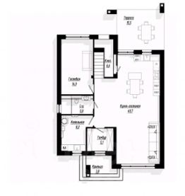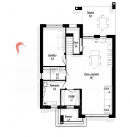 Первый этаж. Большая кухня-гостиная, гостевая спальня, гостевой санузел, бойлерная, кладовая терраса.