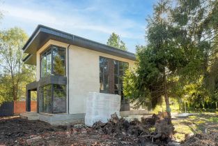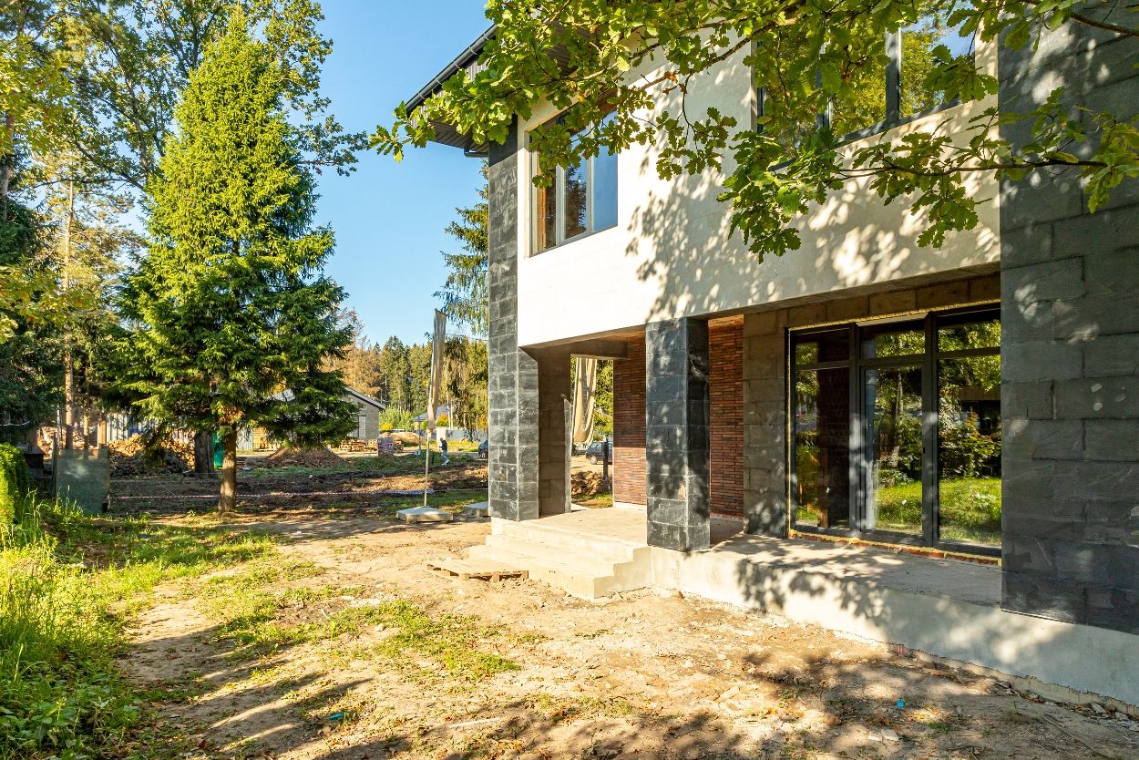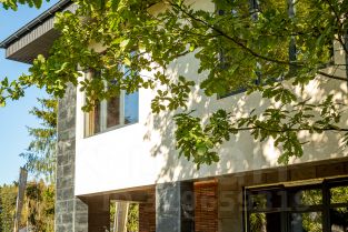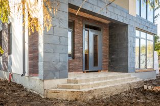 Дом выполнен в современном архитектурном стиле, объединяющем строгие геометрические формы, большие панорамные окна и натуральные материалы (теплый керамический блок и природный камень)