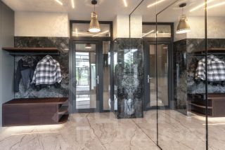 Функциональность: Гараж на 2 авто с входом в дом, большая постирочная, множество гардеробных и мест для хранения.