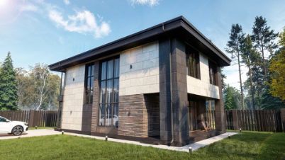 Дом выполнен в современном архитектурном стиле, объединяющем строгие геометрические формы, большие панорамные окна
