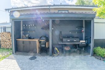 — Летняя кухня с BBQ-зоной: гриль Oklahoma Joe, керамический гриль-"яйцо", роллеты для защиты в непогоду