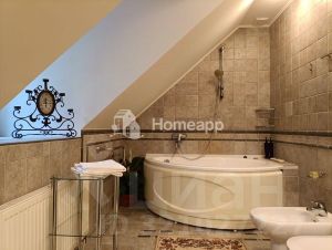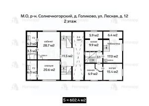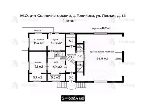 Номер лота: 86937. Продается загородный дом площадью 602.4 м² в элитном посёлке Голиково-2, в 8 км от МКАД. Дом состоит из 2 частей: бревенчатого и каменного дома, сочетая экологичность и надежность. В доме имеются бассейн, сауна, бильярдная, тренажеры, большая музыкальная гостиная-салон с просторной террасой. В деревянной части: двусветная гостиная, зеркальная гимнастическая комната, малая столовая и каминная комната. Санузлы с окнами. На техническом цокольном этаже: несколько кладовых комнат, постирочная, серверная. Оборудован зимний гараж на 2 машины, площадка на 3 м/м и навес для 4 машин. Детская площадка под окнами хозяйского кабинета. Участок 16,85 сот. с выходом в лес. В поселке круглосуточная охрана, видеонаблюдение с выводом на пульт охраны.