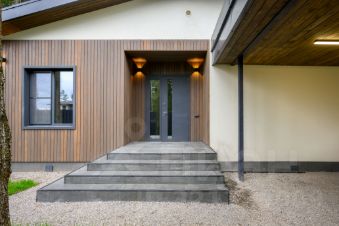 В отделке использованы современные материалы и технологии. Продуманы практичные детали: наружные розетки для гирлянды и зарядки, уличный кран для полива, подогрев ступеней у входа, ниша под робот-пылесос и многое другое.