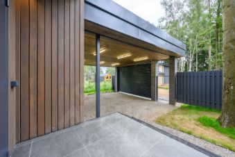На участке: веранда, навес на 2 авто с розеткой для зарядки электромобиля.