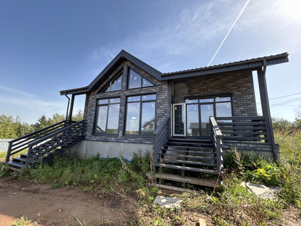 Дом: каркасный, утепленный, панорамное остекление, окна Rehau Grazio, фасадная плитка HAUBERK, крыша металлочерепица GRAND LINE CLASSIC, железная дверь.