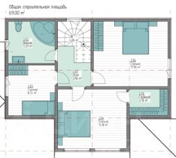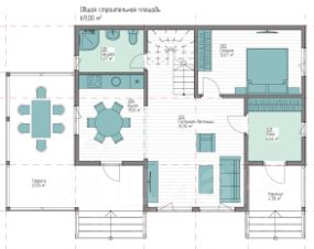 1 этаж: терраса (23 кв.м), кухня-гостиная (26 кв.м), спальня, санузел, прихожая, тех помещение, крыльцо;