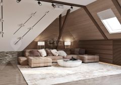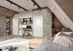 - Мансардный этаж (76 м2): Комната отдыха 33 м2; Душевая 11 м2; Гардеробная с доступом к тех. помещению 17 м2; Кладовка 7 м2.