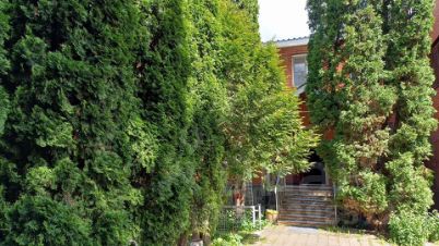 Участок ухожен: дорожки, садовые кустарники и деревья, хорошие металлические ворота, парковка для нескольких машин.