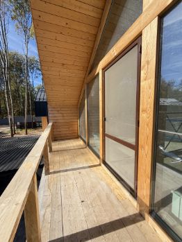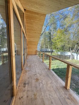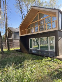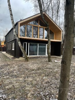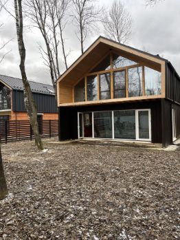 Оформление и отделка фасадов во многом обусловлены архитектурой. Боковые стены второго этажа уже зашиты фальцем, фронтоны полностью застеклены, а широкие свесы кровли обшиты деревом. Внешняя отделка стен первого этажа выполнена из лиственницы, что придаёт дому эстетичный и природный вид. Лиственница, благодаря своим устойчивым к влаге и гниению свойствам, обеспечивает долговечность и защиту от негативных воздействий внешней среды. Такой выбор материала также способствует хорошей теплоизоляции и создает приятную атмосферу. Природный цвет и текстура лиственницы гармонично вписываются в окружающий ландшафт, подчеркивая экологичность и стиль загородного дома.