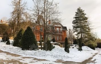 Красивый кирпичный дом на участке с ландшафтным дизайном.
