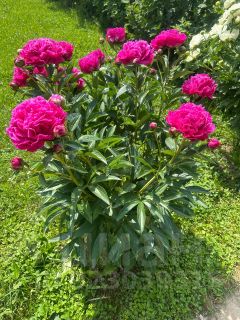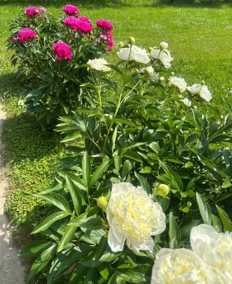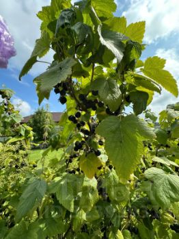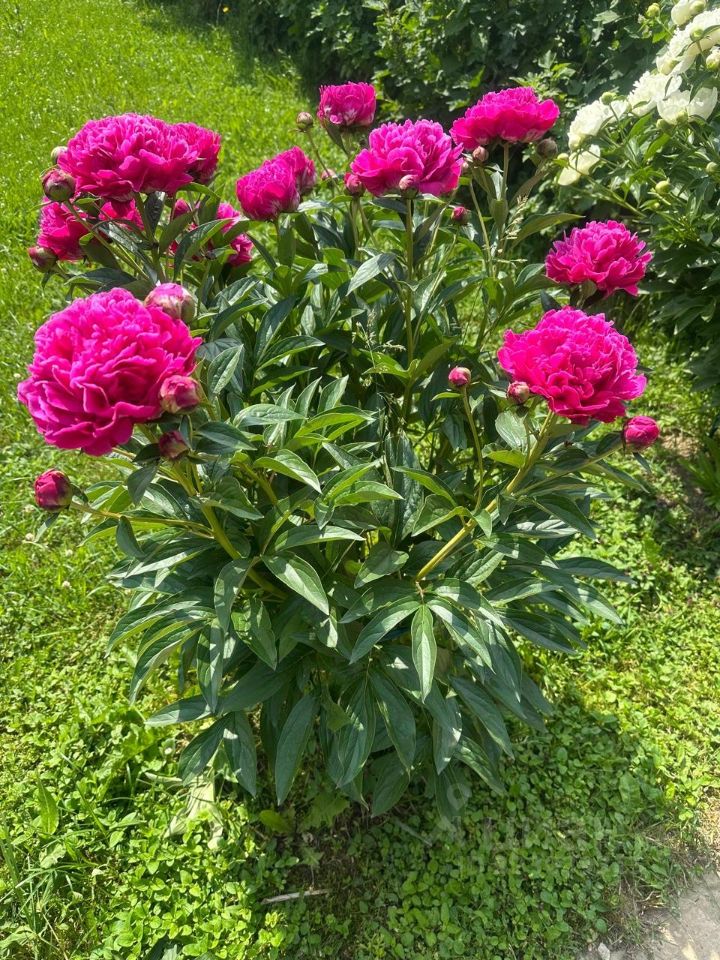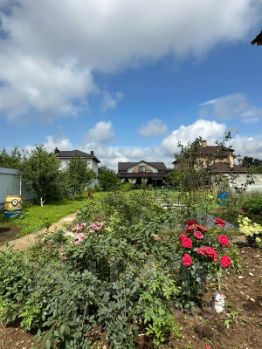 Участок правильной формы, с плодовыми деревьями и кустарниками: яблоня, слива, черешня, кусты смородины, малины, несколько грядок с клубникой и зеленью, прекрасные кусты пионов.