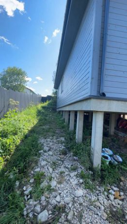 Дом стоит на монолитной плите, на монолитных сваях.