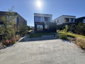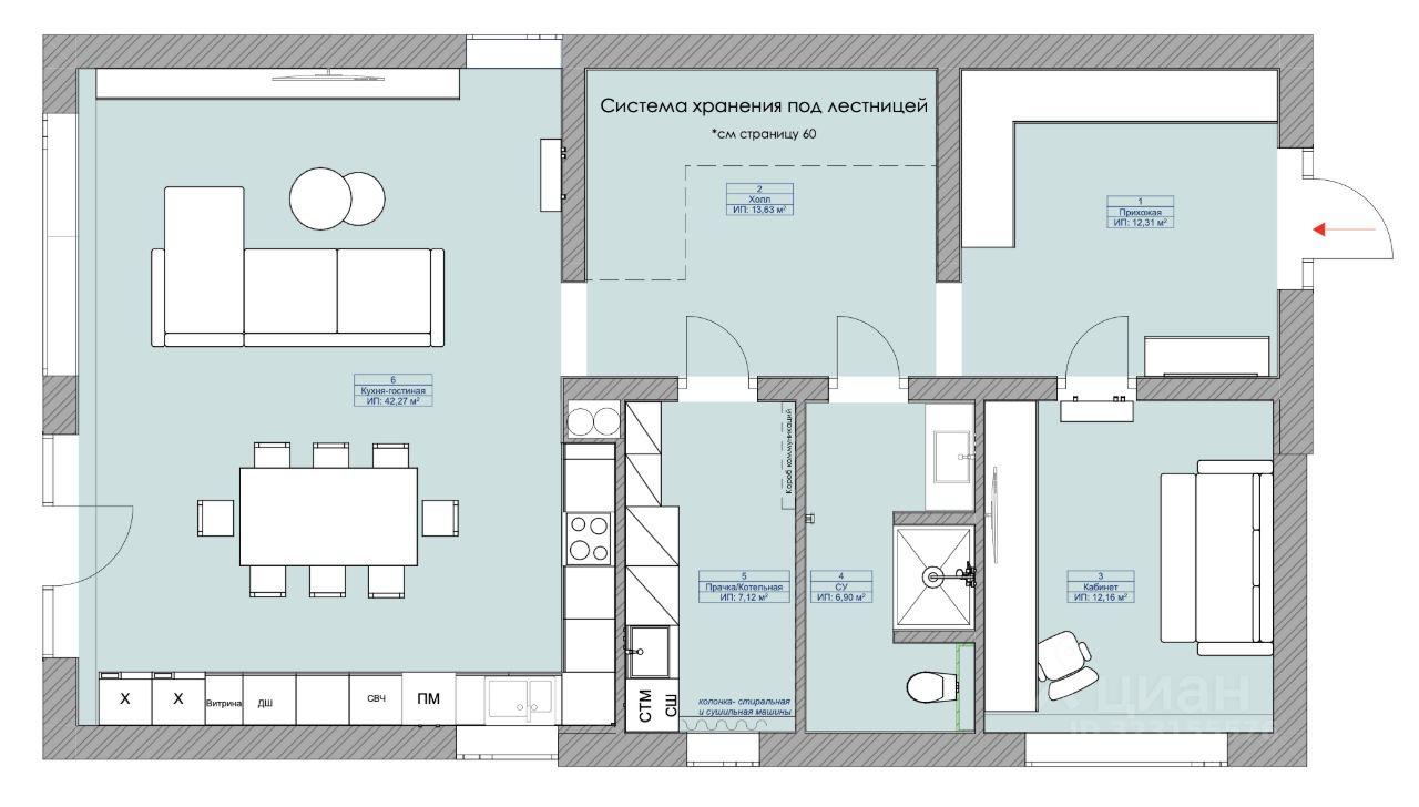 • Просторная кухня-гостиная с панорамными окнами с выходом на террасу и участок с ладшафтным дизайном