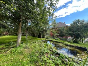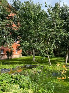 Участок ухожен и облагорожен: дорожки, газон, много лесных и фруктовых деревьев, хвойные деревья (сосны и ели), красивые кустарники, цветы, пруд, огород и теплица, гостевой 2-х этажный дом.