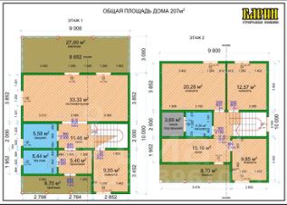 Общая площадь 207 кв.м. Большая гостиная, совмещенная с кухней. На первом этаже 1 спальня, На втором этаже 3 спальни и рабочий кабинет.