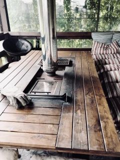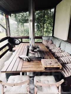 Веранда 27 кв.м. с зоной барбекю по мотивам фильма Джентльмены. Веранда закрыта от дождей и снега полимерным мягким стеклом.