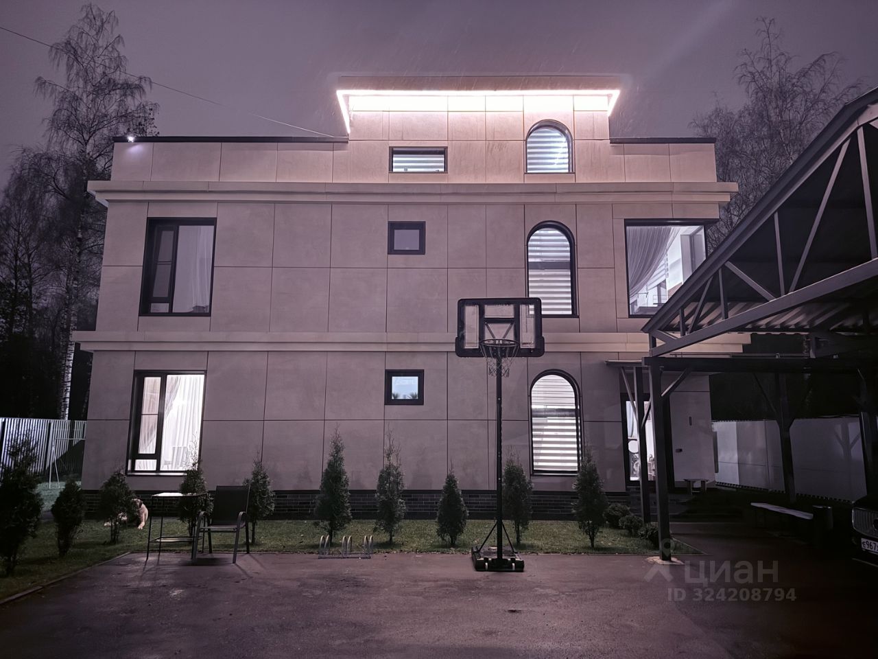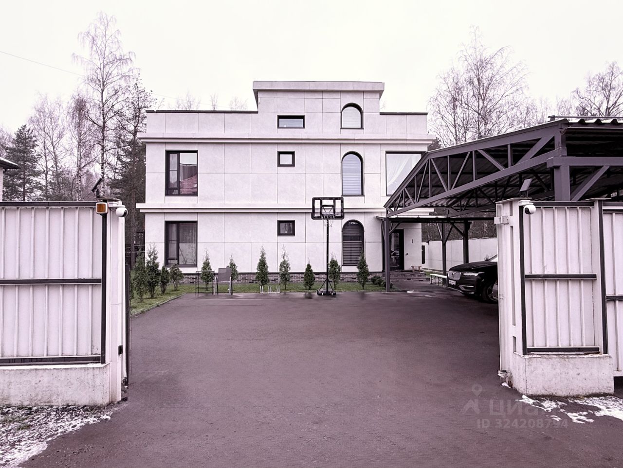 Участок закрыт, автоматические ворота. Навес на 3 автомобиля, перед домом размещается до 8 машин. Передняя зона — асфальт и газон, задняя — газон. Тихие соседи; за задней границей участка расположена федеральная зелёная территория, обеспечивающая стабильную тишину и неизменность окружения.