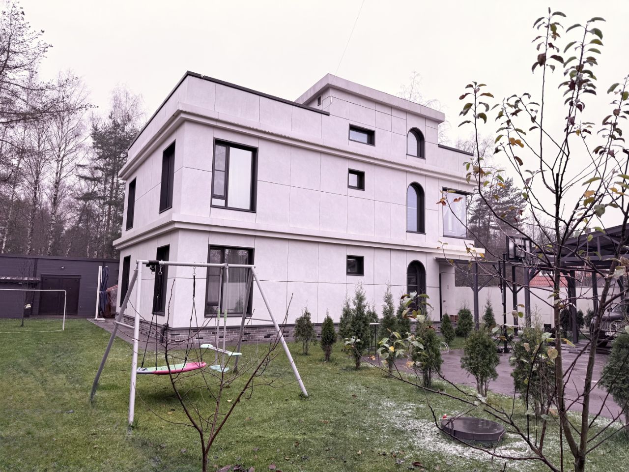 Фундамент — двухуровневый монолит (лента + плита), ~1,2 м, бетон B35, полная гидро- и теплоизоляция. По периметру — сплошной дренаж. Участок поднят крупным объёмом песка: вода после дождей не задерживается, территория работает как естественный дренаж.