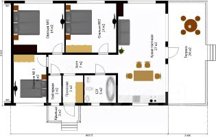 — По плану предусмотрено 3 спальни, большая кухня-гостиная, холл, санузел, бойлерная и подсобные помещения.
