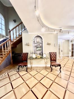 Крытый гараж , совмещенный с домом и большое пространство на внутренней придомовой территории для размещения транспорта.