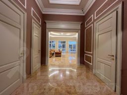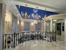 2 этаж: холл, зимний сад, кабинет с выходом на балкон, хозяйская спальня с камином + санузел с джакузи и душевой + гардеробная, две детские с санузлами и гардеробными.