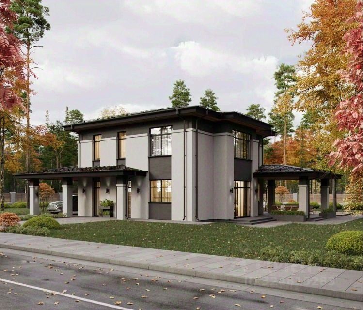 В подарок покупателю: архитектурно-конструктивный проект дома 210 м2 в стиле райт с навесом для авто, хозблоком и большой террасой, разработанный известной компанией.