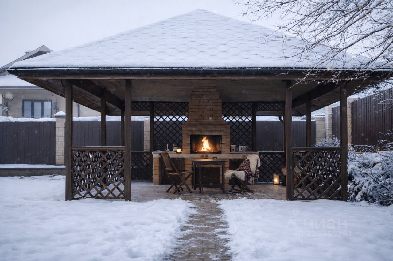 Отдельного внимания заслуживает крытая беседка с камином и зоной барбекю — уютное пространство для встреч в любое время года, включая зиму