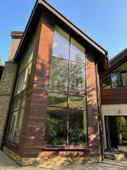 На смом большом витражном окне (площадь 90кв.м) устроено из теплого алюминиевого профиля (как в торговых центрах) и теплозащитными стеклами