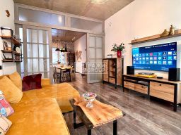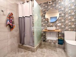 1 этаж: прихожая, кухня, гостиная, санузел с душем и тёплым полом. На кухне есть вся необходимая мебель и техника, удобный остров с барной стойкой. В гостиной стол ручной авторской работы.