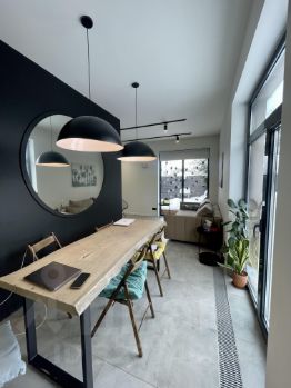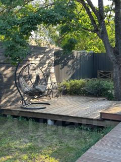 Этот дом - это дизайнерская квартира с панорамными окнами, террасой на которую можно попасть из каждой комнаты, зеленой зоной, цветами, lounge зоной с качелями под раскидистым кленом и все это на небольшом участке с личной парковкой, также выделено место под небольшую баню.